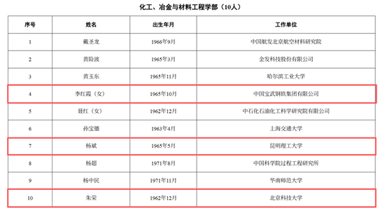 北京科技大學呂昭平等當選中國科學院院士,中國寶武鋼鐵集團有限公司李紅霞、昆明理工大學楊斌、北京科技大學朱榮等當選中國工程院院士。