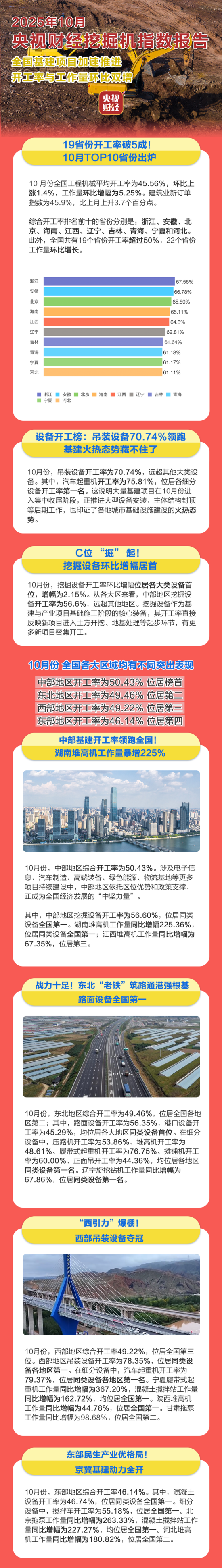 挖掘機(jī)是基礎(chǔ)設(shè)施建設(shè)的“標(biāo)配”,是反映基礎(chǔ)設(shè)施建設(shè)、觀察固定資產(chǎn)投資等經(jīng)濟(jì)變化的風(fēng)向標(biāo)。央視財(cái)經(jīng)與三一重工、樹根科技聯(lián)合打造的“央視財(cái)經(jīng)挖掘機(jī)指數(shù)”發(fā)布了最新相關(guān)數(shù)據(jù)。數(shù)據(jù)顯示,10月份,雖然受國慶與中秋雙節(jié)假期影響,但是全國工程機(jī)械平均開工率與工作量仍實(shí)現(xiàn)環(huán)比雙增。