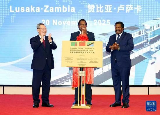 當?shù)貢r間11月20日,國務院總理李強在盧薩卡同贊比亞總統(tǒng)希奇萊馬、坦桑尼亞副總統(tǒng)恩欽比共同出席坦贊鐵路激活項目開工儀式。新華社記者 姚大偉 攝