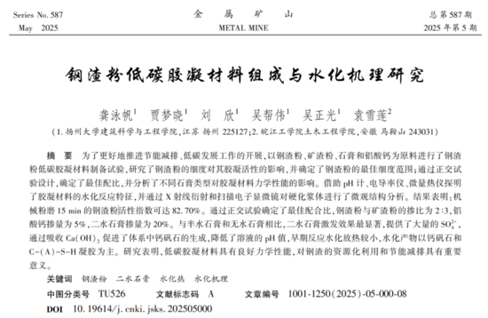 針對當前低碳膠凝材料存在的強度偏低、鋼渣利用率不高等問題,揚州大學龔泳帆團隊開展了鋼渣粉低碳膠凝材料的組成設計與水化機理研究。該團隊以鋼渣粉、礦渣粉、石膏和鋁酸鈣為原料,制備了一種鋼渣粉低碳膠凝材料;探討了鋼渣粉細度對其膠凝活性的影響,確定了鋼渣粉的最佳細度范圍;通過正交試驗明確了材料的優化配比方法;闡明了石膏類型對低碳膠凝材料性能的影響機制,并揭示了該低碳膠凝材料的水化機理。該研究對促進鋼渣資源化利用、推動行業節能減排具有重要意義。目前該研究內容已獲專利授權。