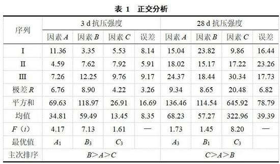以凈漿抗壓強度為評價指標,通過正交試驗并結合方差、極差分析得到鋼渣粉低碳膠凝材料最佳配合比:鋼渣與礦渣的摻比為2∶3、鋁酸鈣的摻量為5%、二水石膏的摻量為20%,此時28 d凈漿試件抗壓強度為44.4 MPa。