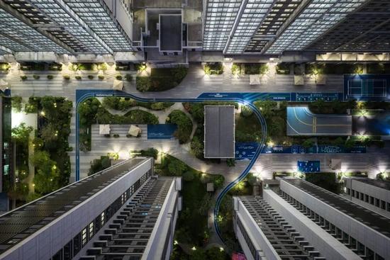 約400米藍色健康環形跑道十分顯眼,如同流淌的河流蜿蜒貫穿于綠植、樓棟之間。(實景圖)