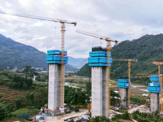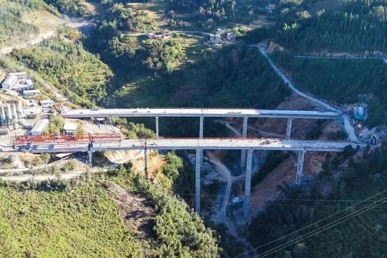 南盤江特大橋全長948米,為預應力混凝土連續剛構橋,按雙向四車道建設標準,最大墩高160米,最大跨度180米。