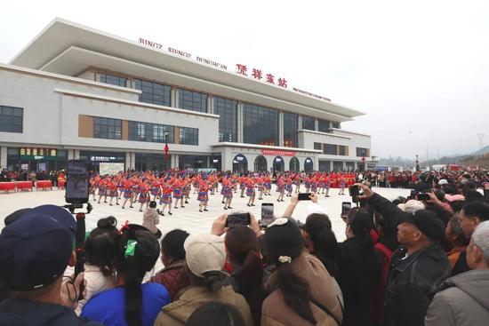 站前廣場上人流如織,有由45名旅客組成的旅行團簇擁在一起合影,有坐在嬰兒車里左右張望的孩童,有直播介紹新線開通的短視頻博主……進站口旁、候車廳內隨處可見拍照的旅客,他們滿心歡喜地記錄自己與憑祥東站的首次同框。